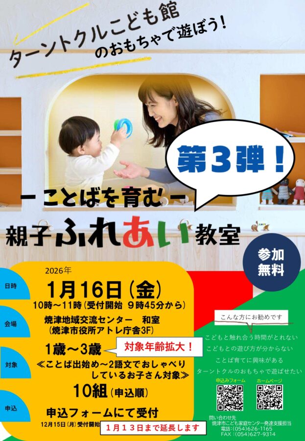 焼津市では、2歳から3歳のお子さんと保護者を対象に、遊びを通じてことばや表現力を育む「親子ふれあい教室」を開催します。