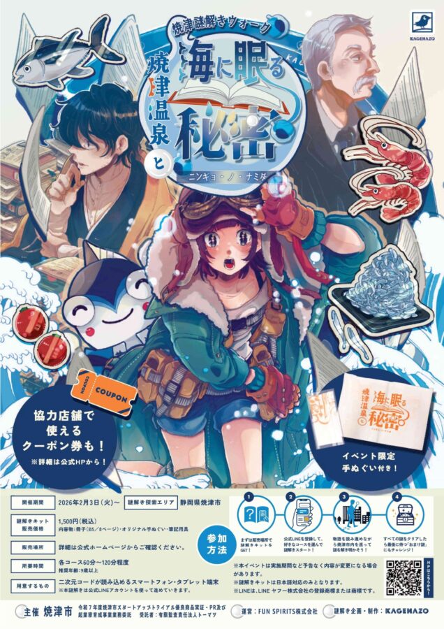 焼津市内のスポットを実際に巡りながら、物語の謎を解き明かしていく街歩きイベントです。「焼津温泉」の魅力に触れながら、隠された真実へと迫る没入感たっぷりの内容となっています。