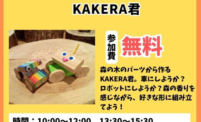 森の木のパーツを組み合わせて、自分だけの「KAKERA君」を作ってみませんか?車にする?それともロボット?想像力を膨らませて、森の香りを感じながらものづくりを楽しめます。