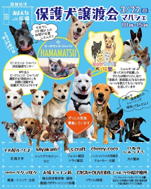 こんにちは!焼津のおよんな広場にて、保護犬の譲渡会とマルシェが同時開催されます。