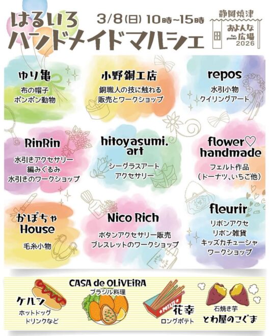 こんにちは!焼津のおよんな広場で、春の訪れを感じる「はるいろハンドメイドマルシェ」が開催されます。素敵なハンドメイド作家さんの作品物販やワークショップ、そして美味しいフードが集まる賑やかな1日です。自分だけのお気に入りを見つけに、ぜひ遊びに来てください。