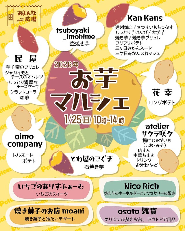およんな広場の今年最初のイベントとして、焼津市にある「およんな広場」にて、お芋づくしの楽しいマルシェ「お芋マルシェ」が開催されます!「さつまいも」と「じゃがいも」の2つの芋が主役のイベントです。
