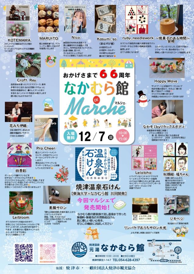 焼津温泉 元湯 なかむら館は、この度創業66周年を迎えます。これを記念して、恒例の「なかむら館 de マルシェ」が開催されます!