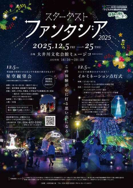 焼津市の大井川文化会館ミュージコを舞台に、幻想的なイルミネーションイベント「スターダストファンタジア」と、宇宙の神秘に触れる「星空観望会」が開催されます!