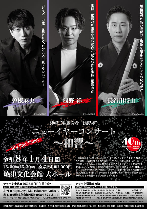 焼津文化会館の大ホールにて、津軽三味線奏者「浅野祥(あさのしょう)」によるニューイヤーコンサート「~和響~」が開催されます。