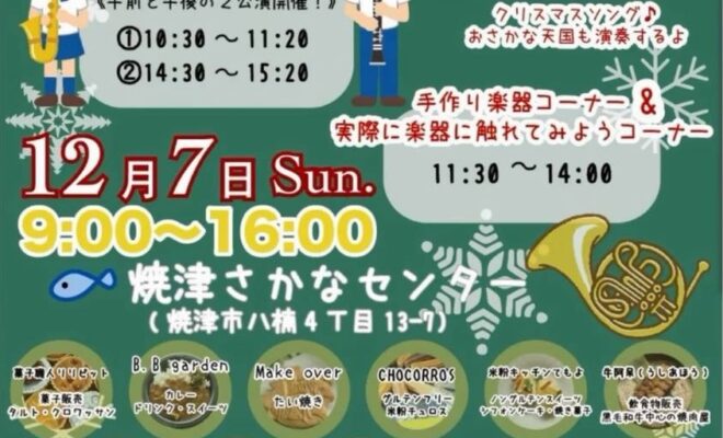 焼津さかなセンター イベント広場にて、市民吹奏楽団とのコラボレーションイベント「港のやいづマルシェ クリスマスパーティーwith吹奏楽」が開催されます。