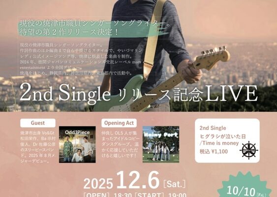 焼津市在住のシンガーソングライター、牧野憲人(まきのけんと)氏の2nd Singleリリースを記念するライブイベントが、焼津文化会館小ホールにて開催されます。