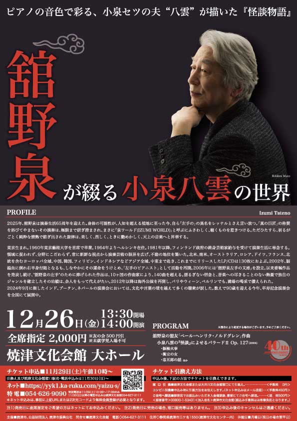 焼津文化会館の大ホールにて、左手のピアニスト・舘野泉による「舘野泉が綴る小泉八雲の世界」が開催されます。