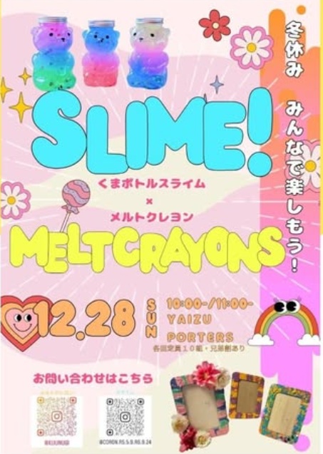 本イベントでは、「メルトクレヨン」と「夜光るクマボトルスライム」の2種類のアートづくりを体験できます。2歳から小学生まで、兄弟での参加も大歓迎です🌈。