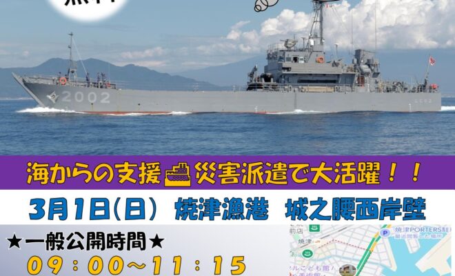こんにちは!焼津漁港の城之腰西岸壁にて、海上自衛隊の輸送艇2号の一般公開が開催されます。