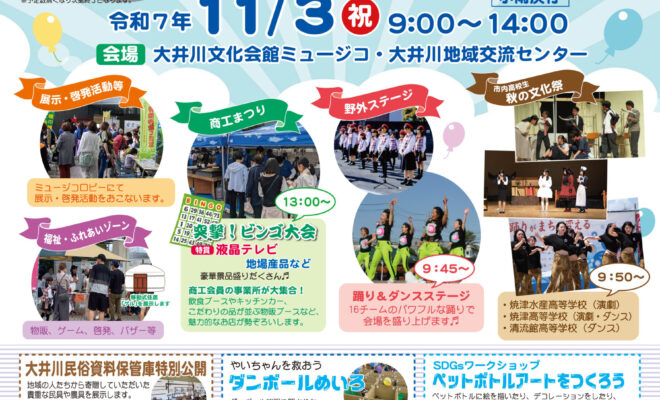 | 日時 | 2025年11月3日(月曜日・祝日) 午前9時~午後3時 ※少雨決行。荒天等の中止判断は当日午前6時に大井川商工会ホームページに掲載されます。 |