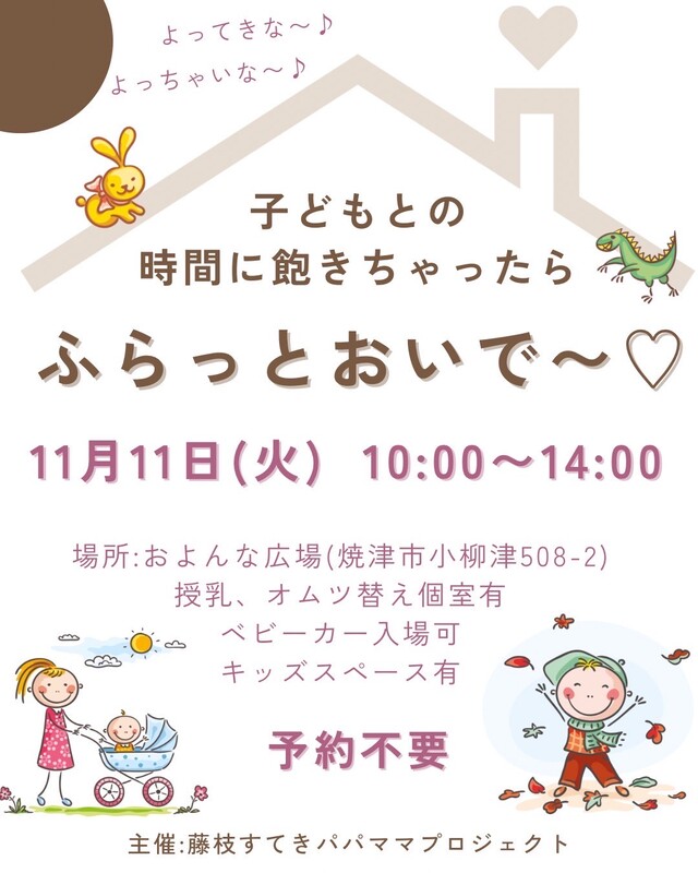 藤枝すてきパパママプロジェクトが主催する、子育て中のパパママが気軽に集えるイベントが、11月11日(火)に焼津市のおよんな広場で開催されます!