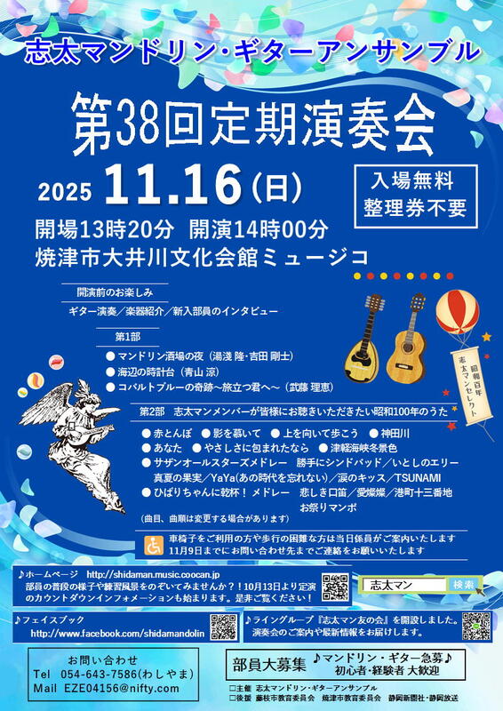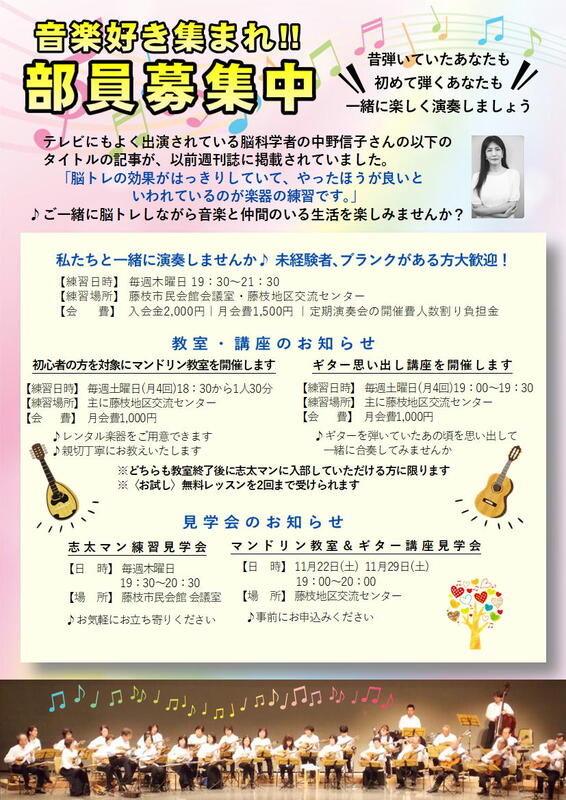 - マンドリン教室・ギター講座見学会: 11月22日(土)・11月29日(土) 19:00〜20:00に藤枝地区交流センターで開催。事前にお申し込みください。