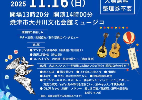 毎年恒例の定期演奏会が、今年も焼津市大井川文化会館ミュージコで開催されます。昭和の名曲やポピュラーな曲など、マンドリンならではの美しい音色を楽しめる機会です。