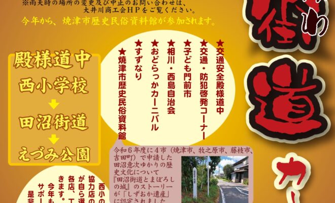 なお、このイベントは、焼津市、牧之原市、藤枝市、吉田町が申請した「田沼街道とまぼろしの城」のストーリーが「しずおか遺産」に認定されたことを記念するものでもあります。