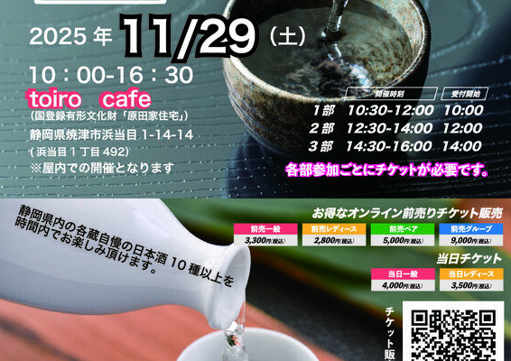 会場は、国の登録有形文化財である「原田家住宅」を改装した風情あふれる古民家カフェ「toiro cafe」。SDGsの理念に根差したこの空間で、東部、中部、西部より厳選された静岡県内各蔵の日本酒を、心ゆくまでご堪能いただけます。