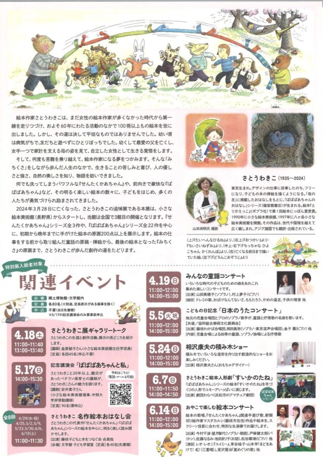 ギャラリートーク(4/18)、名作絵本おはなし会(4〜6月・全8回)、記念講演会「ばばばあちゃんと私」(5/17)、各種コンサート(4/19・5/5・5/24・6/7・6/14)など。詳細は公式サイトをご確認ください。