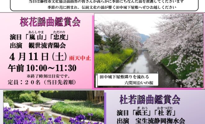 史跡田中城下屋敷の趣ある空間で、春にちなんだ謡曲を鑑賞できます。詳細なプログラムや参加費については公式サイトまたは直接お問い合わせください。