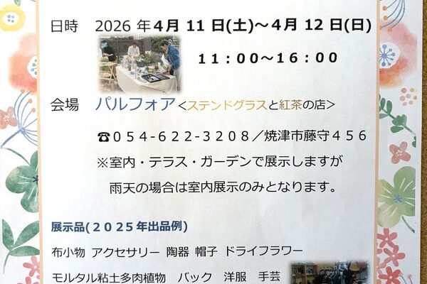 焼津市藤守のカフェギャラリー パルフォアで、4月11日(土)・12日(日)に「ハンドメイド いっぴん展」が開催されます。