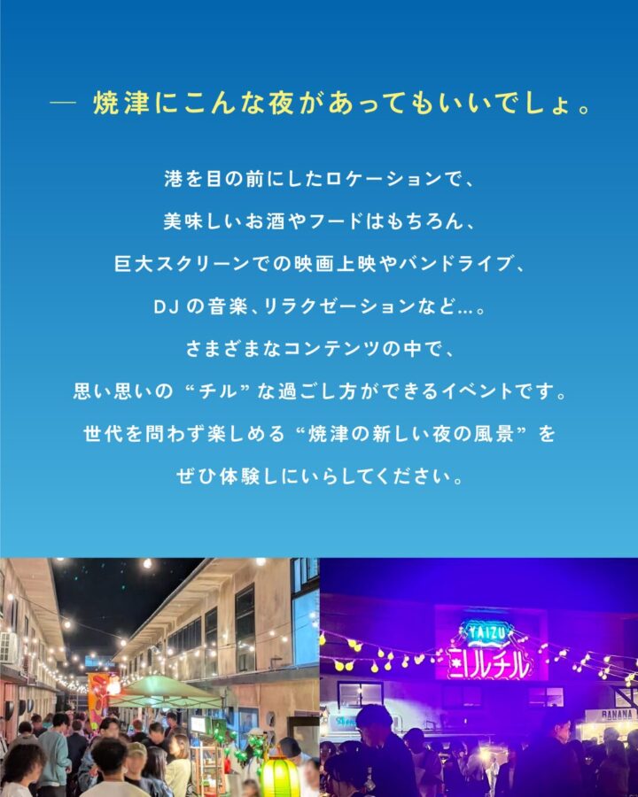 「焼津にこんな夜があってもいいでしょ。」をテーマに、港町ならではの新しい夜の風景を楽しむイベントです。