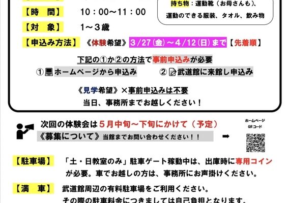 親子で一緒に体を動かせる無料体験会です。申込締切は4月12日(日)ですのでお早めにどうぞ。4月24日(金)にも同様の体験会があります。