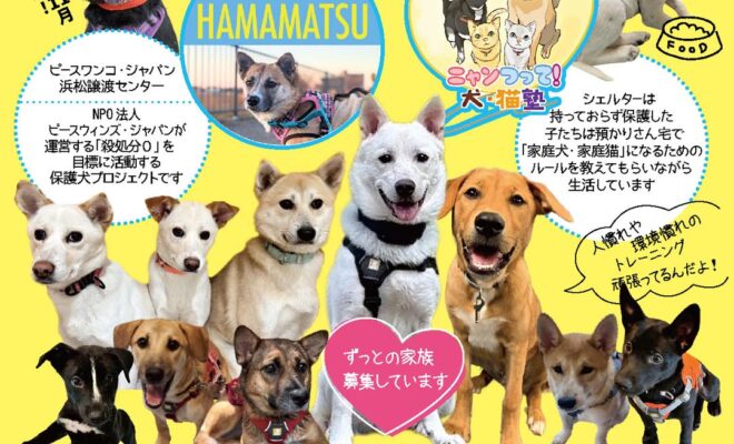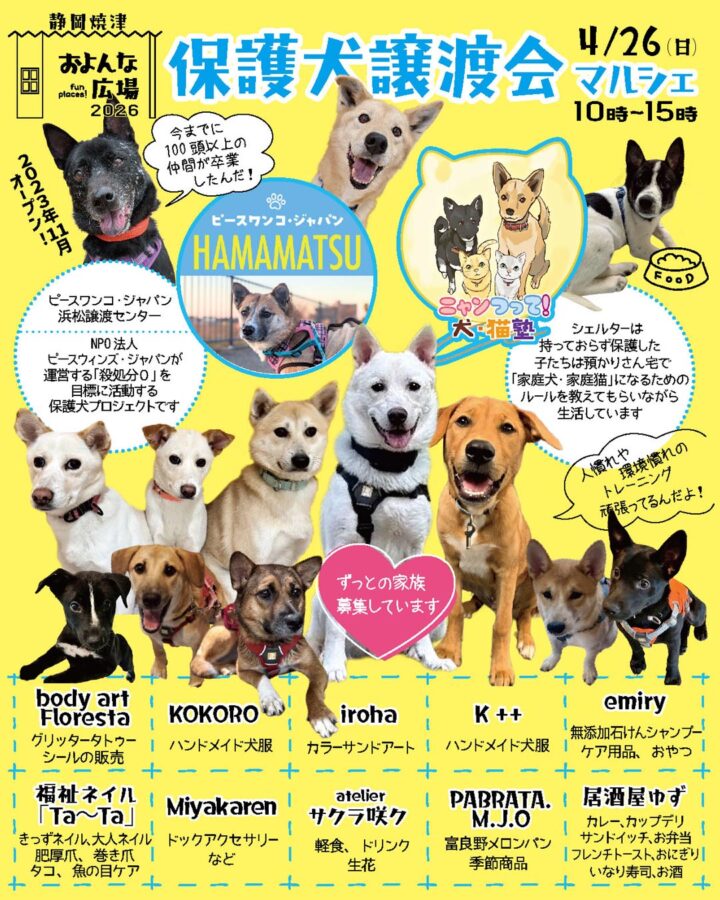 焼津市小柳津の「およんな広場」で、保護犬の譲渡会とマルシェが同時開催されます。