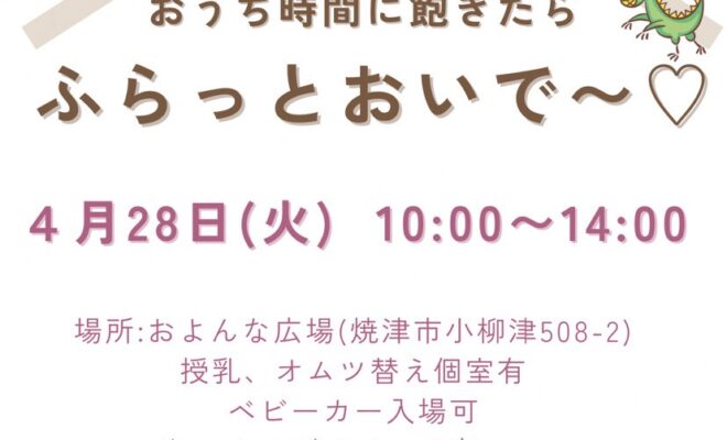 GW直前の平日、気軽にふらっと立ち寄れるイベントです。4月28日(火)10時〜14時、焼津市小柳津のおよんな広場でお待ちしています。