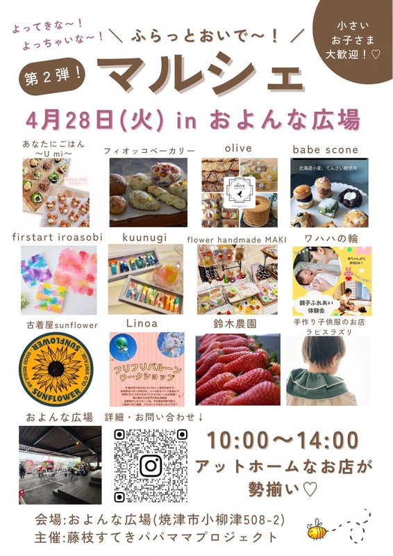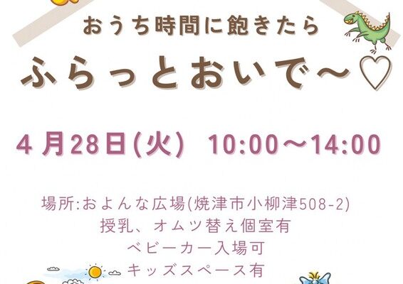 焼津市小柳津のおよんな広場で、4月28日(火)に子育てママと子どもを対象にした「ふらっとおいで〜」が開催されます。入場無料で、気軽に立ち寄れる親子向けのマルシェイベントです。