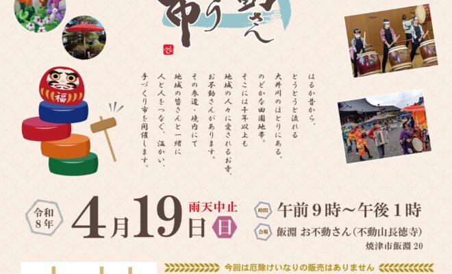 焼津市飯淵の「飯淵のお不動さん(長徳寺)」参道で、手づくり市が開催されます。