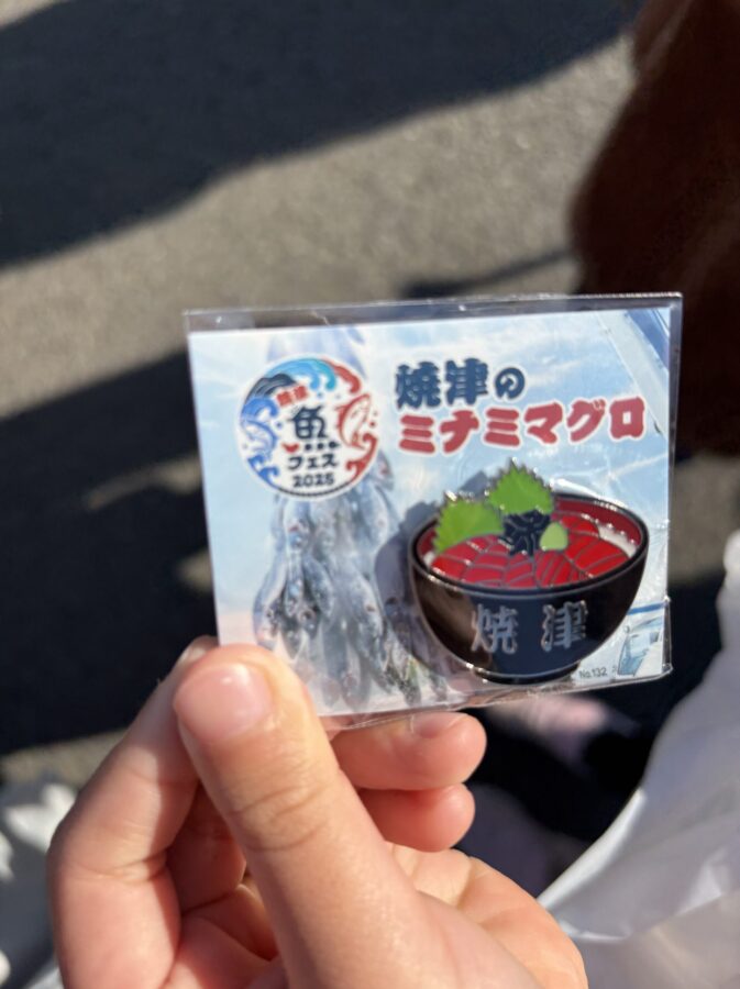 アンケートに答えると、ミナミマグロ丼のピンバッチをもらうことができます。