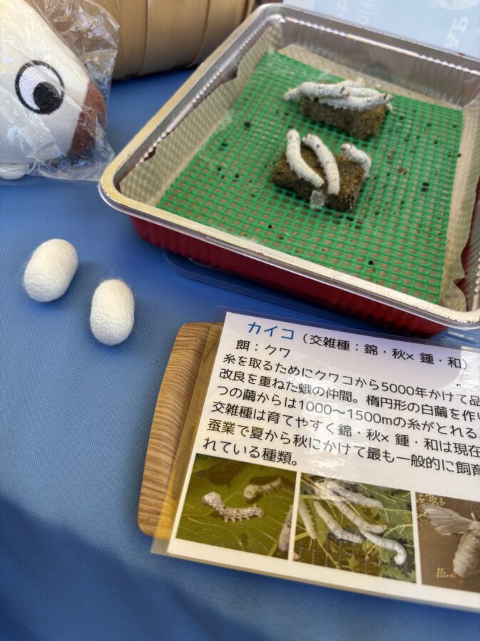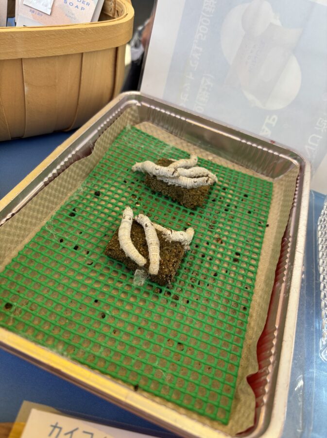 展示ブースを回っていたところ、本物の蚕(かいこ)を発見しました。