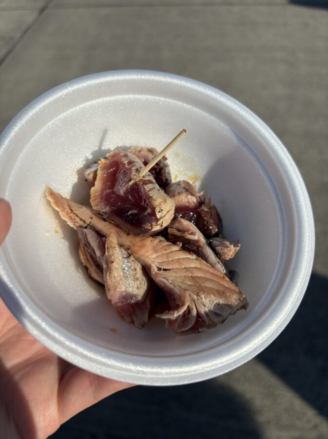 例えば、まぐろ丼、まぐろ串焼き、まぐろ頭肉ステーキ丼、鰹節削りの実演販売、かつおの藁焼き実演販売など、焼津らしさ満点のブースがたくさんあってどれも美味しそうです。