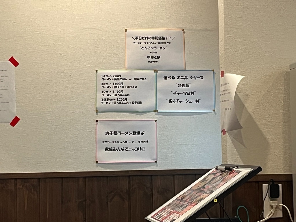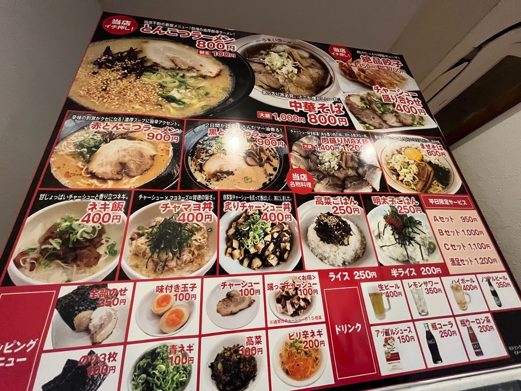 リニューアル後のメニューは、豚骨ラーメンを軸としつつ、サイドメニューも充実しています。