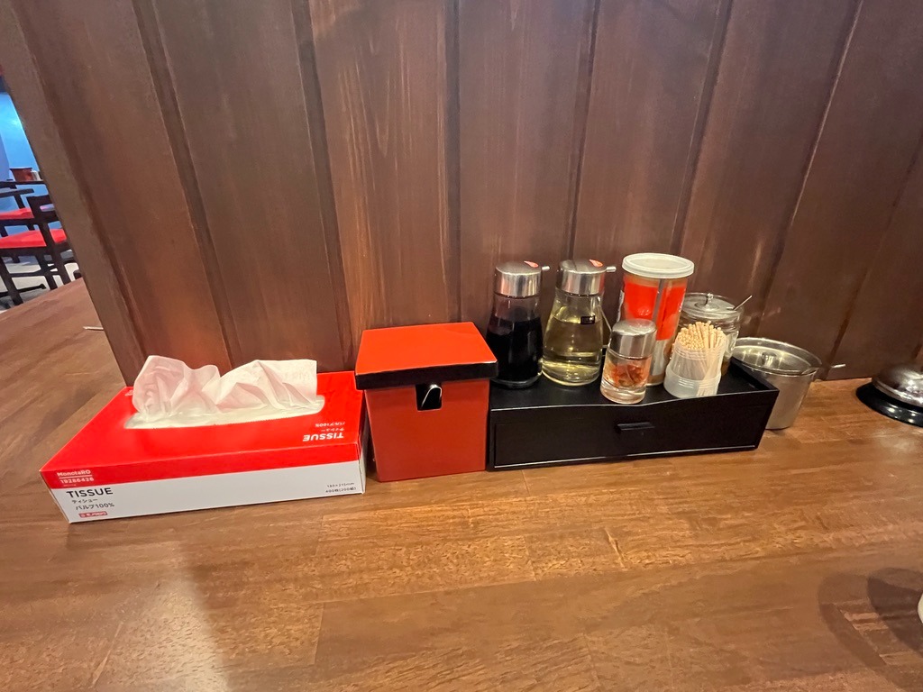 各テーブルにはティッシュボックスのほか、醤油・七味・胡椒などの調味料が並んでいます。