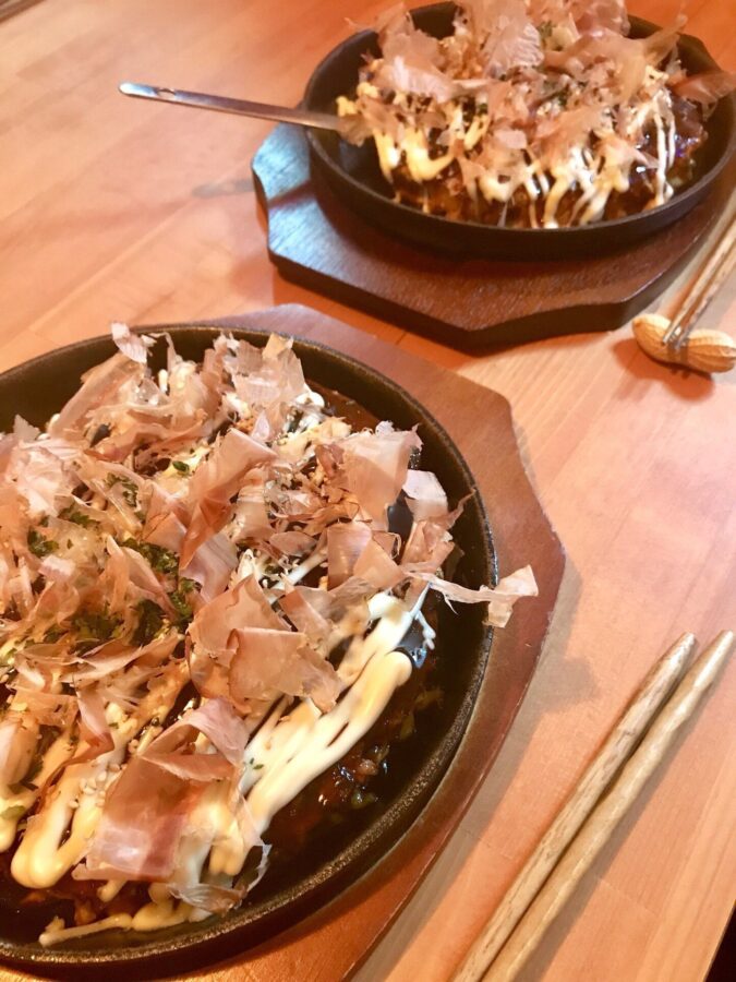 目の前で焼き上げるお好み焼きは、外はカリッと、中はふわっと絶妙。