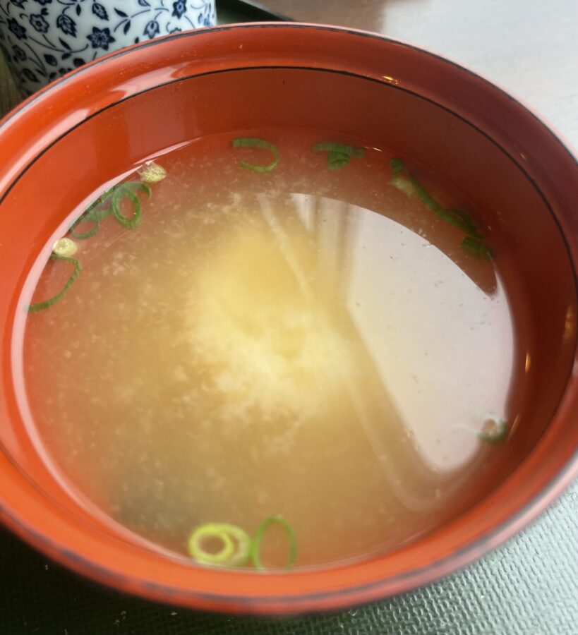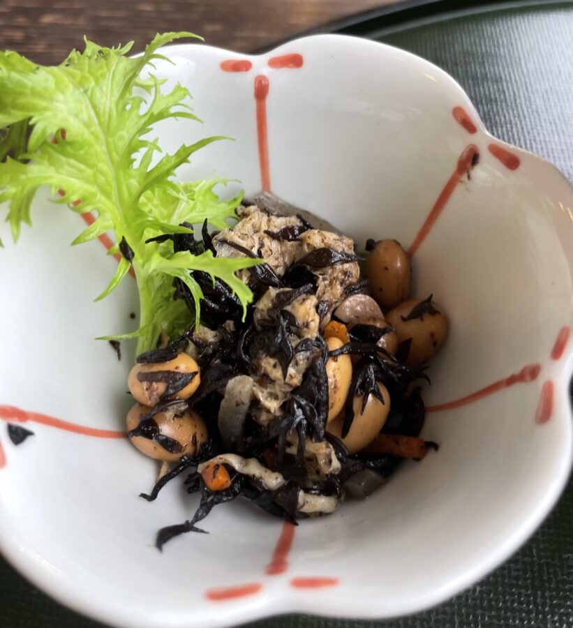 付け合わせのひじきと大豆のお浸し小鉢とお味噌汁、漬物も美味しかったです。