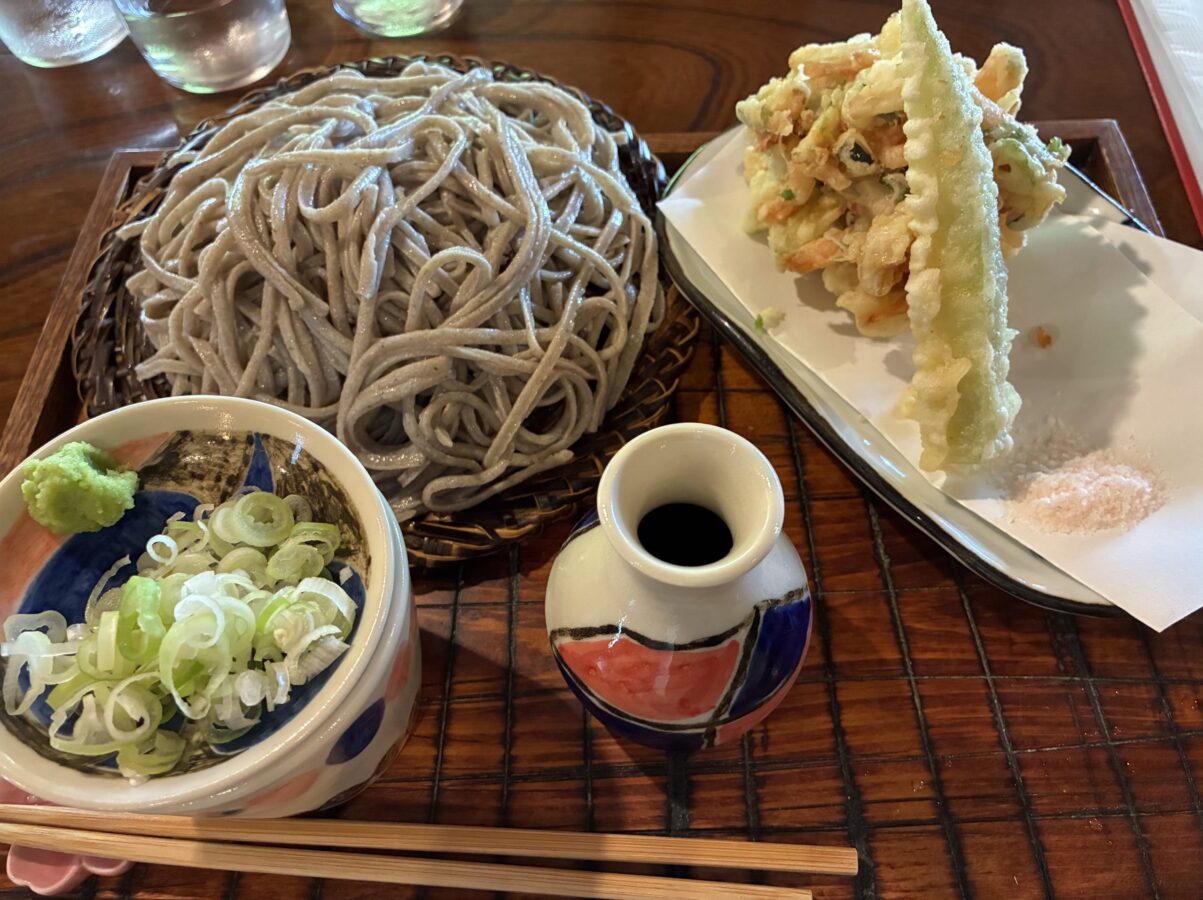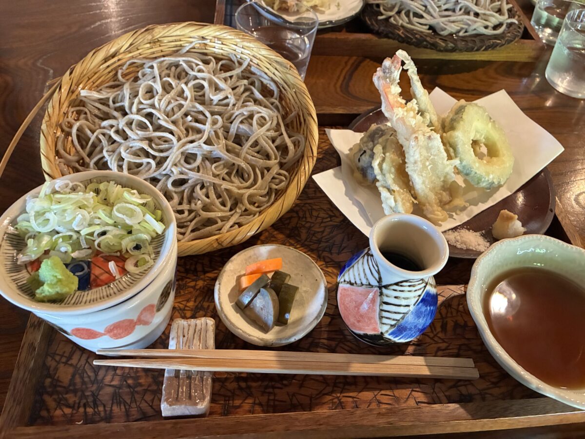 季節の野菜、大きめの海老、地魚などの天ぷらが付いた冷たいせいろそば。
