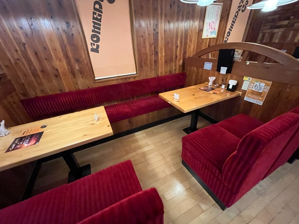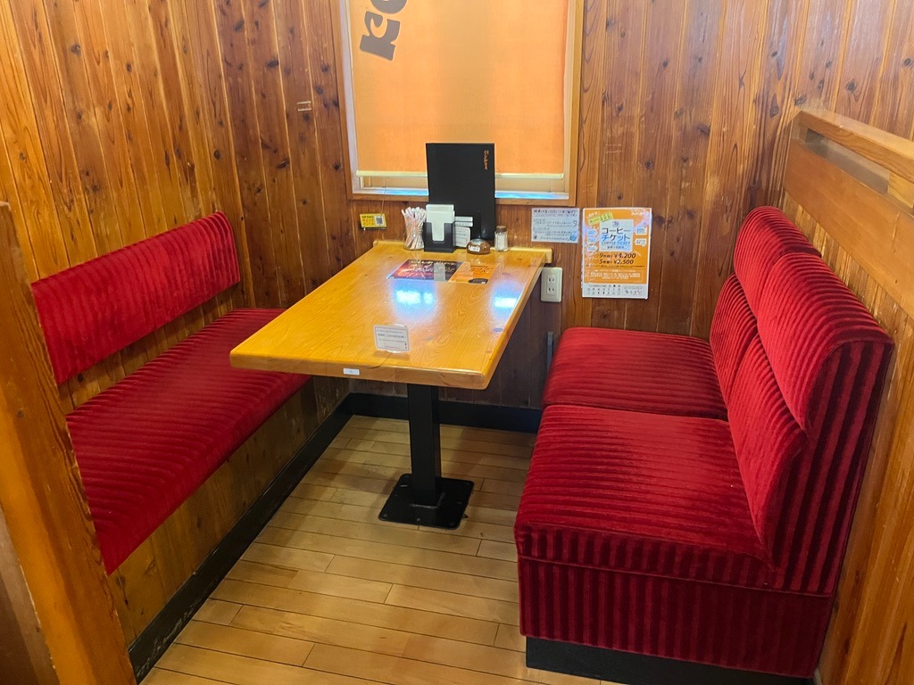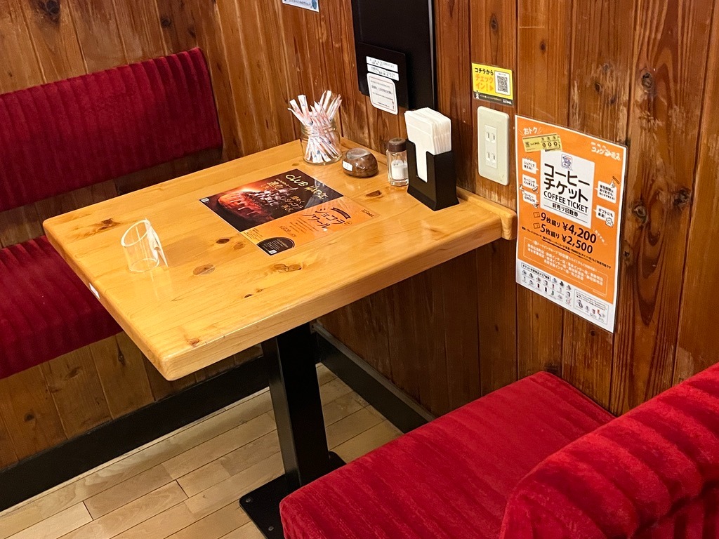 コメダ珈琲の座席は、赤いソファを使用しています。