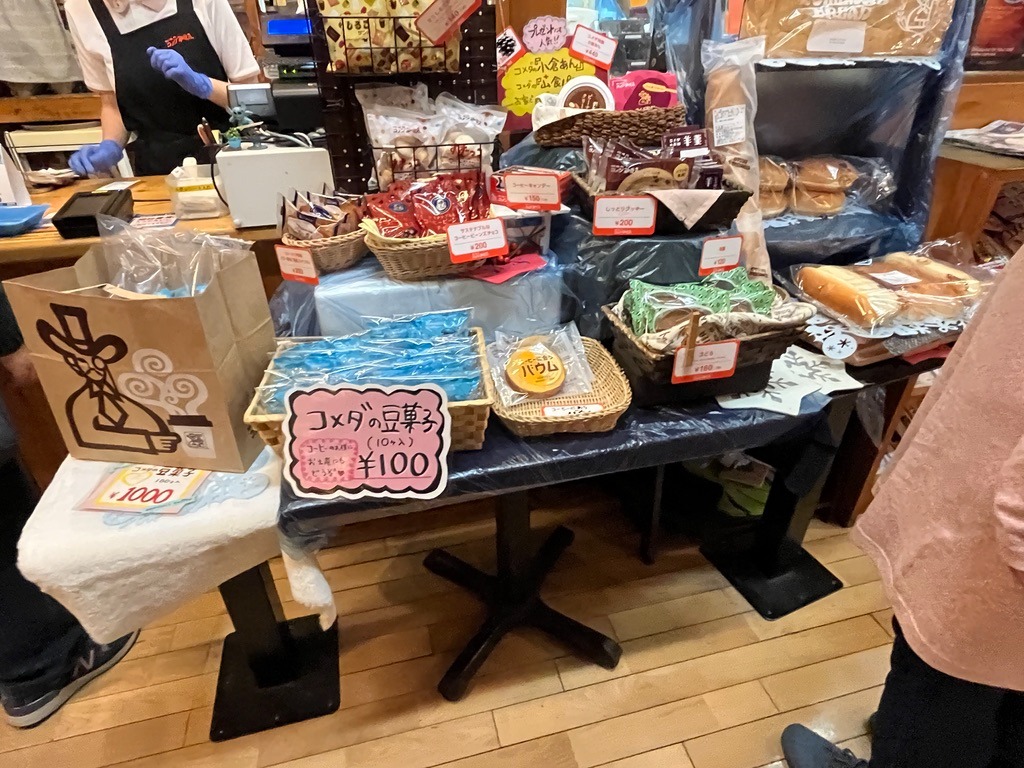 ここには、ドリンクのおまけとしてお馴染みの「豆菓子」をはじめ、バウムクーヘンやチョコレートといったコメダ特製のお菓子がずらりと並んでいます。
