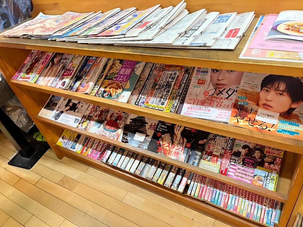 コメダ珈琲店を訪れてまず目に留まるのが、レジのそばに設置された大きな新聞・雑誌ラックです。