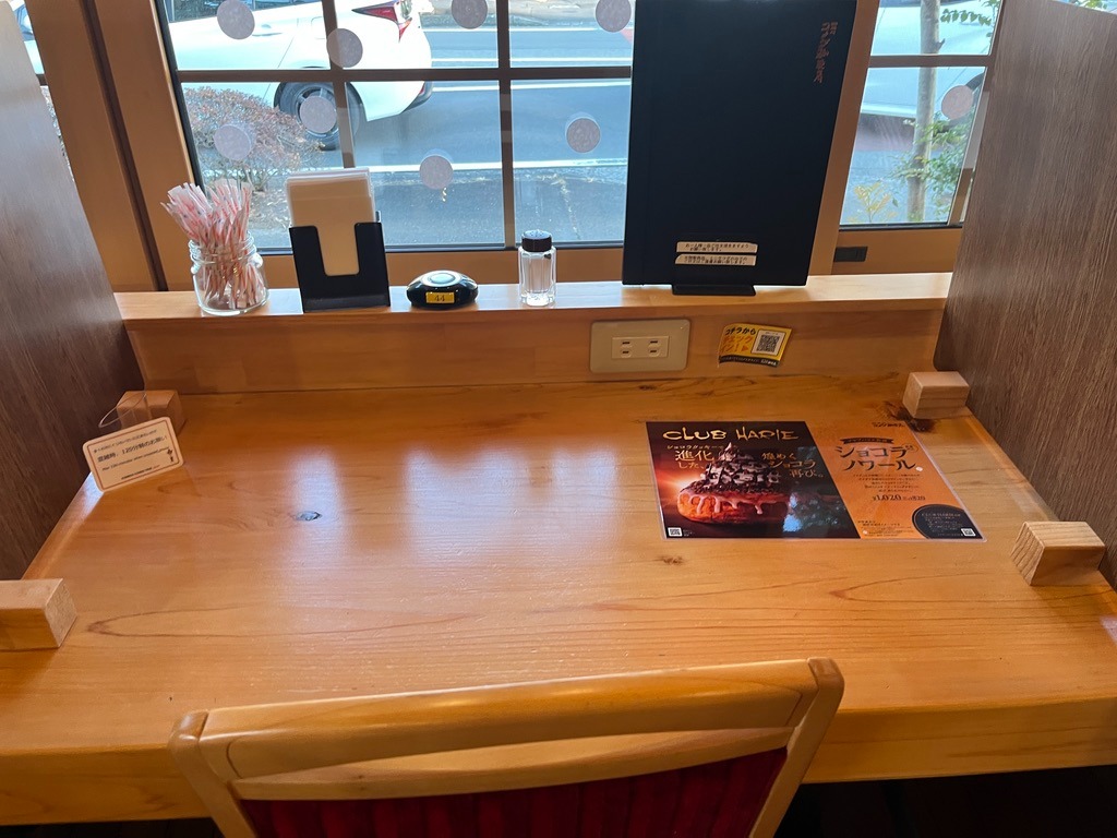 コンセントがあるだけでなく、左右に仕切りがあるので仕事や勉強に集中できるのがこの席の強みです。