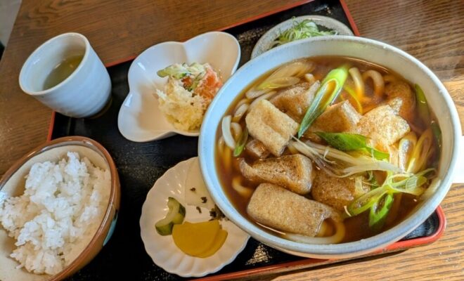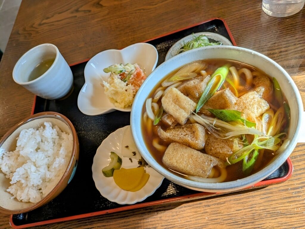 写真の「こんこん定食」は、甘じょっぱく煮た油揚げがたっぷり乗ったうどんと、ご飯がセットになった岩久の人気メニュー。