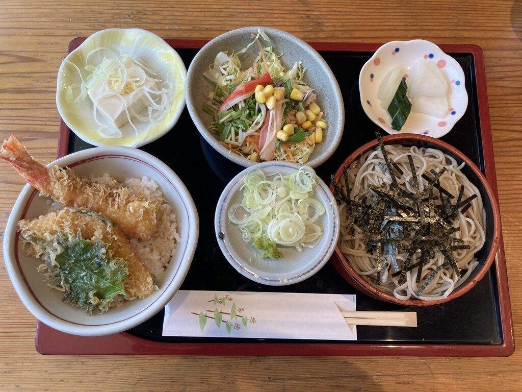 特に、甘辛いタレが染み込んだミニカツ丼や天丼+麺のセットは、お腹いっぱい食べたい方におすすめ!(※写真は蕎麦のセットです)