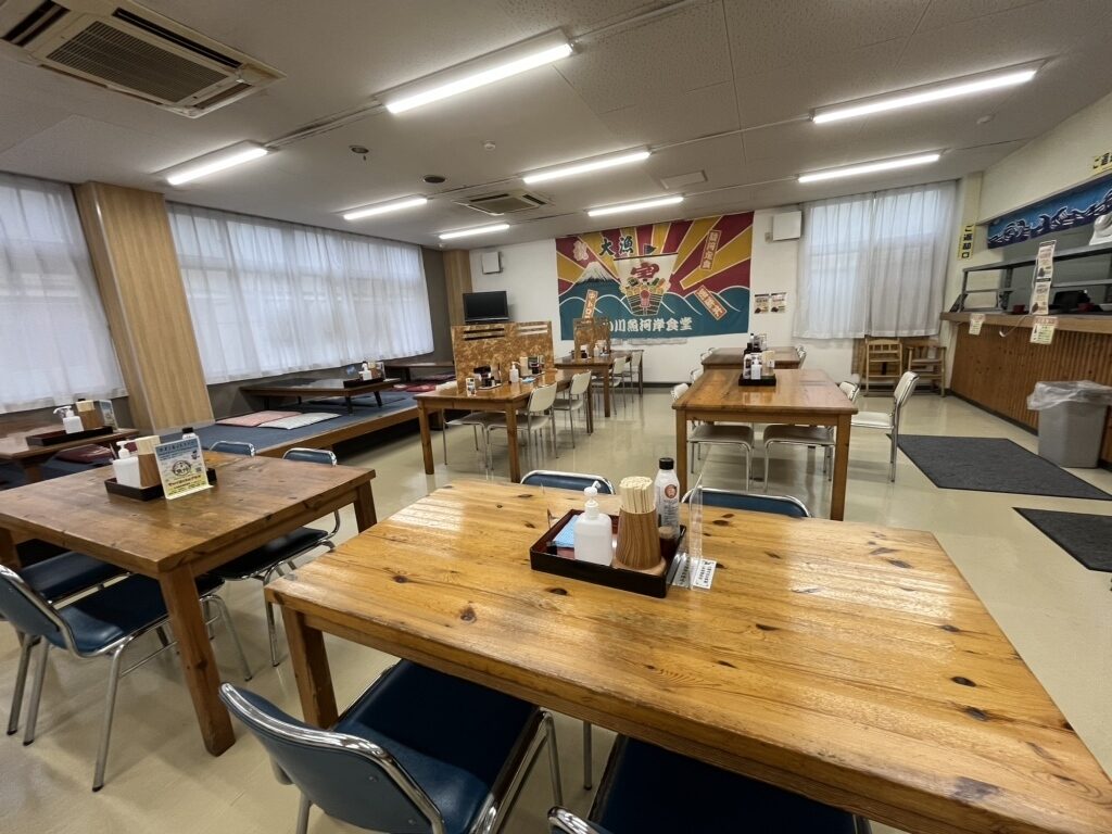 小川港のすぐ目の前にある「小川港魚河岸食堂」は、市場の活気をそのまま形にしたような大型食堂。