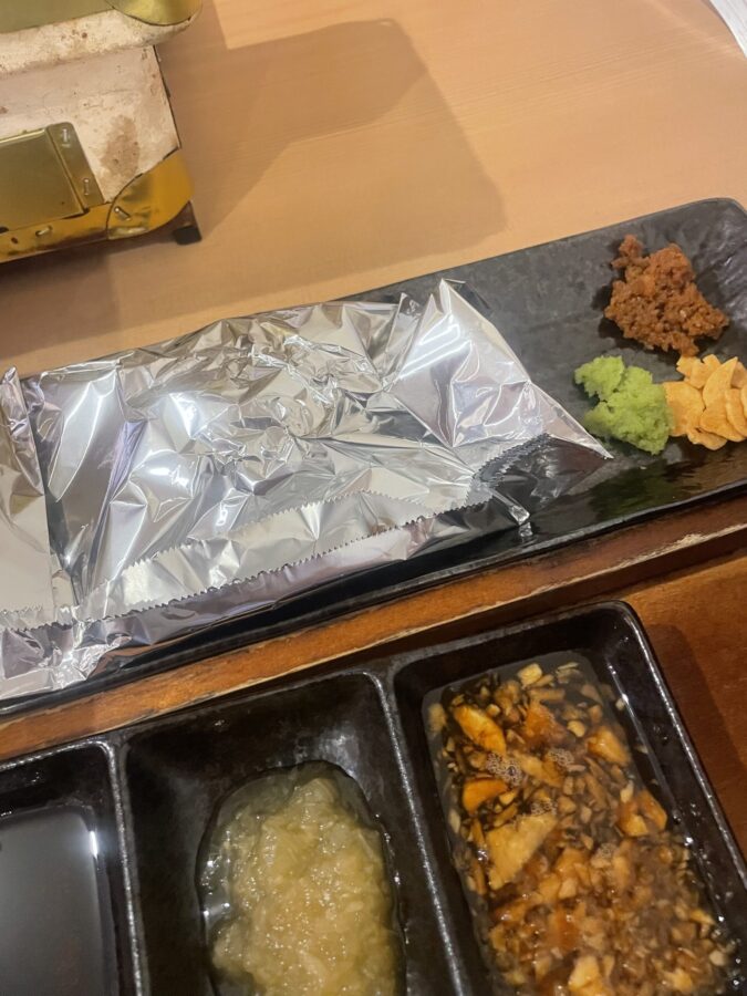 こちらも七輪で好みの焼き加減になるまで焼いてお好きな味で食べることができます!