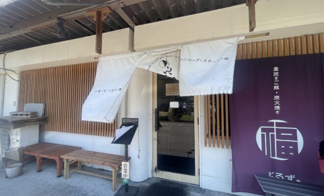 - 『和牛ハンバーグ定食。炭焼きハンバーグ&煮込みハンバーグ(白米、味噌汁、小鉢、野菜、デザート付き)1860円(税込)』
