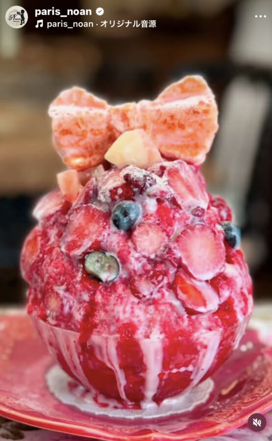 こだわりの氷にゴロゴロとたくさんのフルーツ、練乳もかき氷に合わせて調合されたオリジナルの練乳を使っています。最後にノアンっぽくメレンゲで作っている可愛いリボンが最高♪