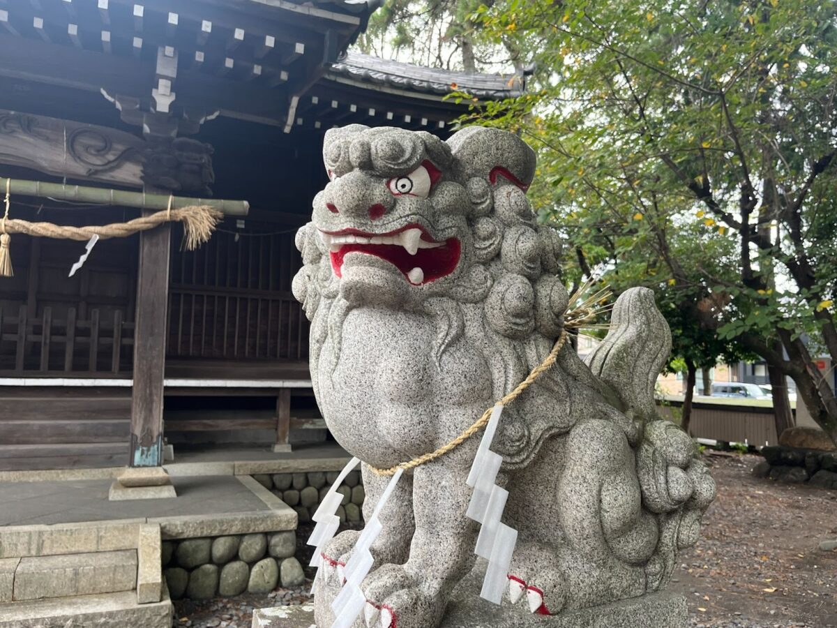 右側の狛犬は口を大きく開け、まるで参拝者を威嚇するかのように立ち尽くしています。