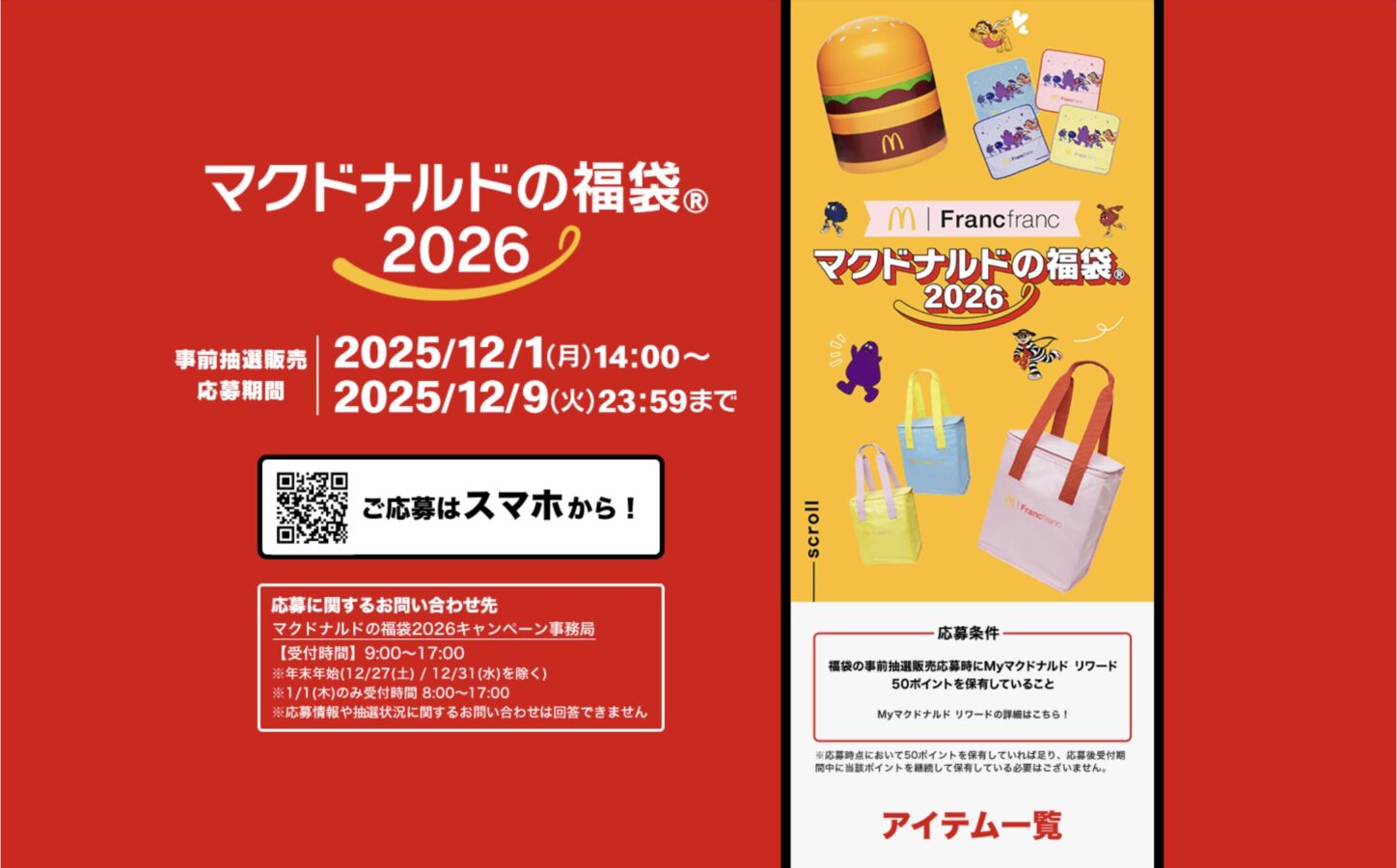 2026年の福袋は2026年12月1日(月)14:00~12月9日(火)23:59までにスマートフォンのマクドナルド公式アプリから事前抽選販売にエントリー。